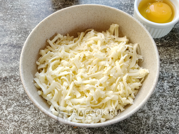 Творог слегка подсолить, натереть на крупной терке сыр.