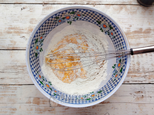 Всыпать просеянную муку, добавить разрыхлитель. Перемешать тесто. Сначала оно получится очень густым.