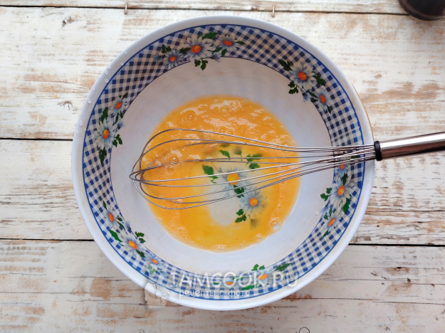 Растереть яйцо до однородности венчиком. Влить масло в яичную смесь.