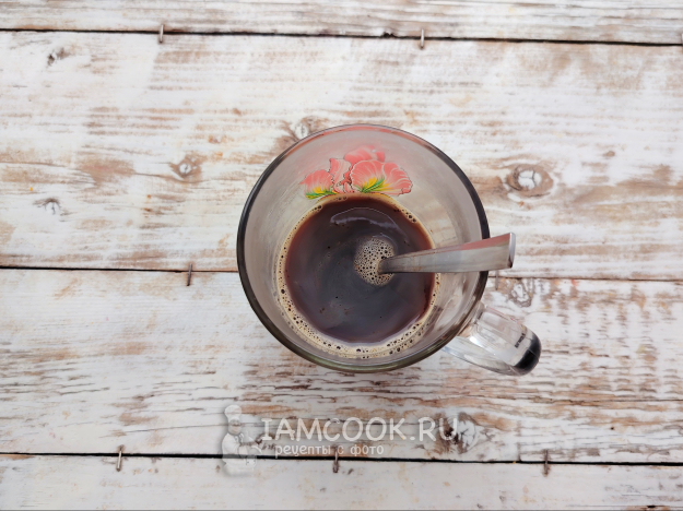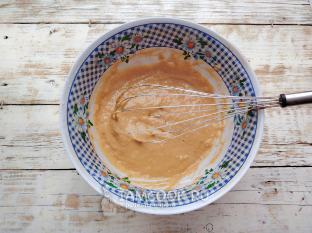 Влить горячий кофе в тесто, одновременно венчиком перемешивая массу, чтобы тесто стало по консистенции как густая сметана и однородным.