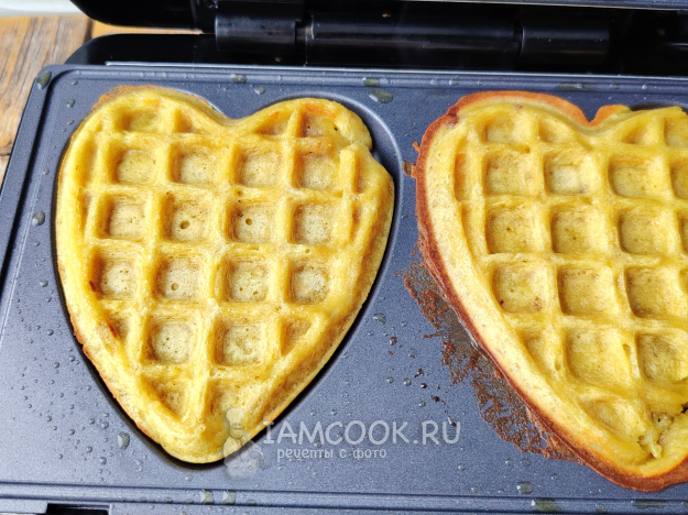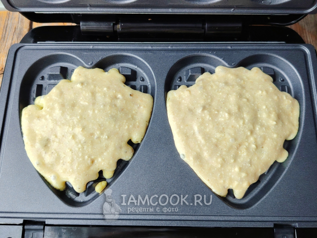 Вафельницу включить, поверхность панелей смазать маслом. Выложить пару столовых ложек в каждую ячейку. Закрыть вафельницу.