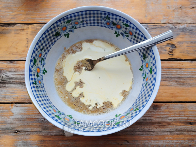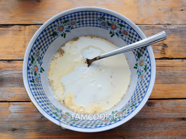 Следом влить кефир. Перемешать смесь.