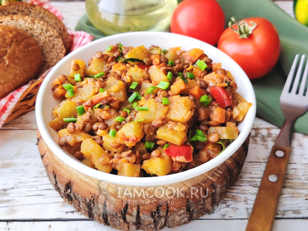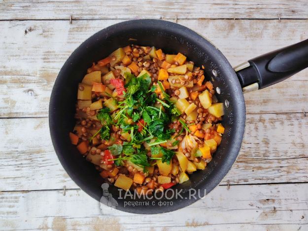 Когда жидкость почти полностью выпарится, добавить рубленую зелень. Выключить огонь, подержать чечевицу с картошкой под крышкой, разложить по тарелкам.