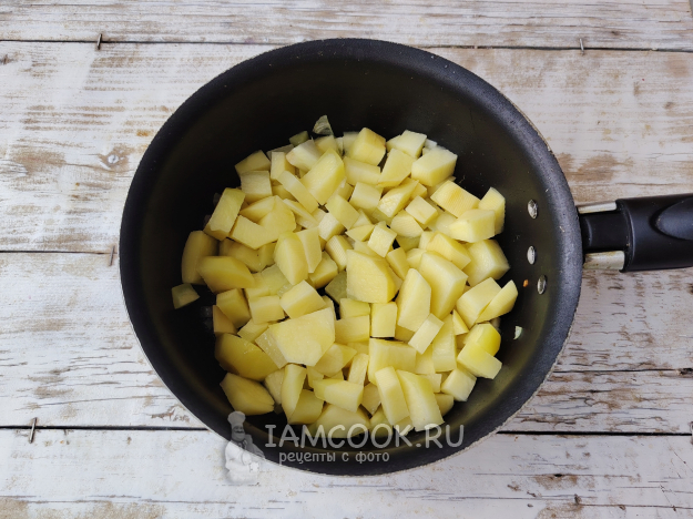 Следом отправить очищенный и нарезанный кубиками картофель.