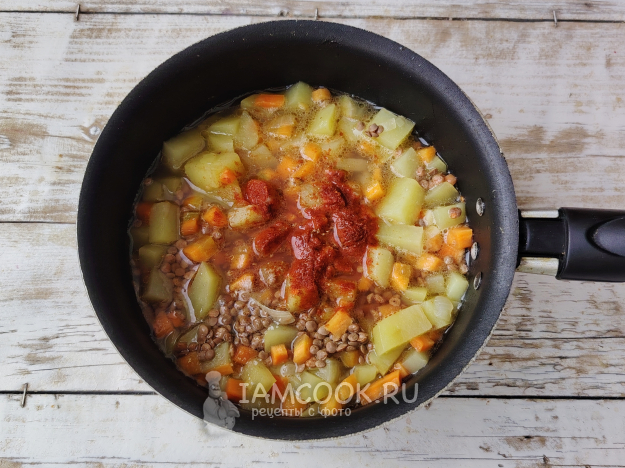 Бобовые отправить к овощам в посуду, влить воду.
