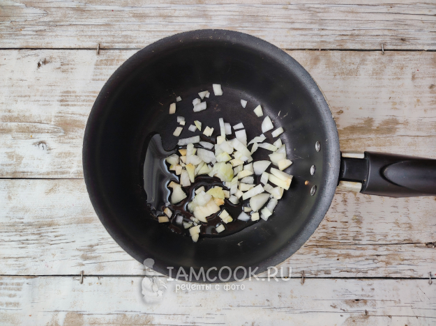 Лук и чеснок почистить, мелко порубить ножом. Выложить овощные кубики на разогретое в сотейнике масло, обжарить до мягкости.