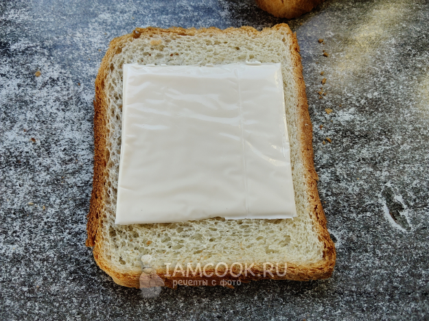 Его надо немного прокатать скалкой, края можно оставить или обрезать. Положить в центр ломтик сыра.