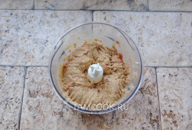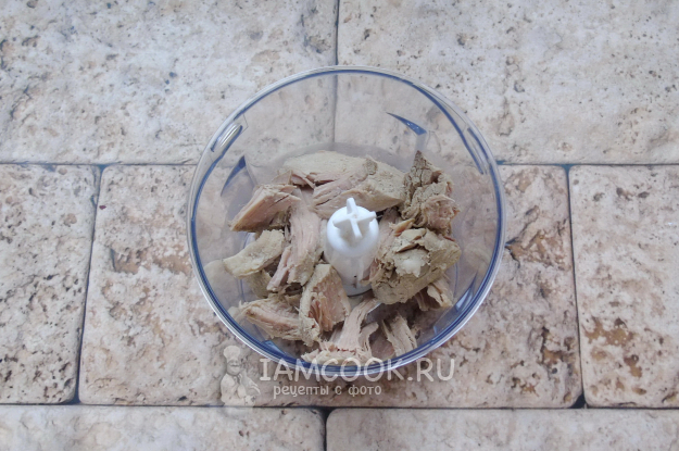 Мясо нарежьте небольшими кусочками и выложите в блендер.