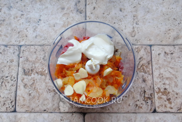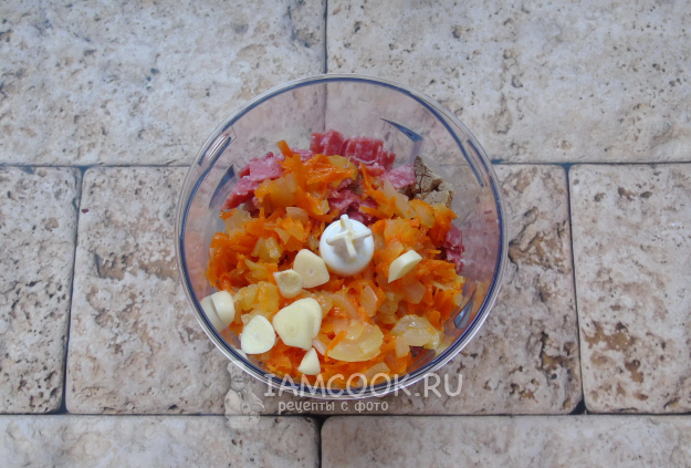 А также морковь с луком выложите в блендер. Добавьте нарезанный зубчик чеснока.