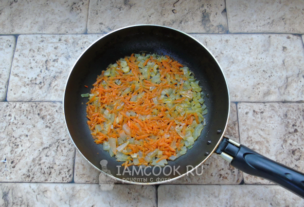 Репчатый лук и морковь очистите, помойте. Лук мелко нарежьте, а морковь натрите на терке. Выложите овощи на сковородку и пассеруйте на небольшом огне до мягкости.