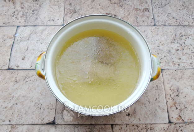 Налейте мясной бульон, посолите, поперчите, еще раз немного взбейте.