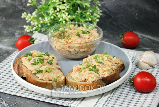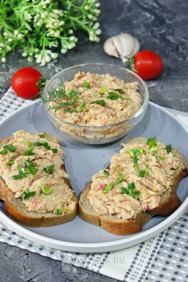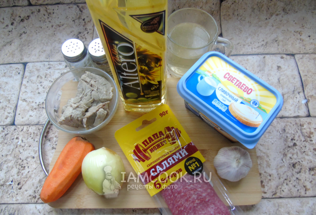 Соберите ингредиенты для приготовления намазки из мяса с салями.