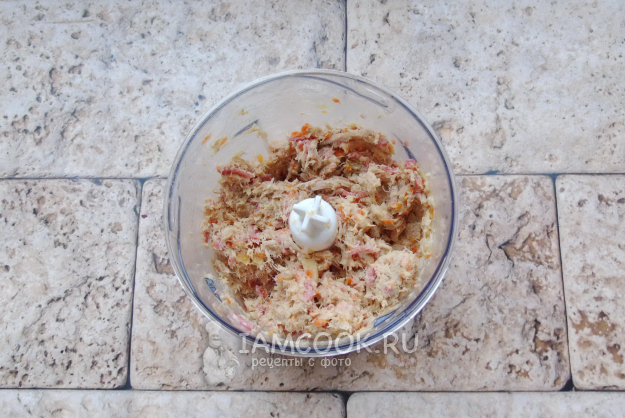Салями тоже мелко нарежьте и добавьте к мясу.