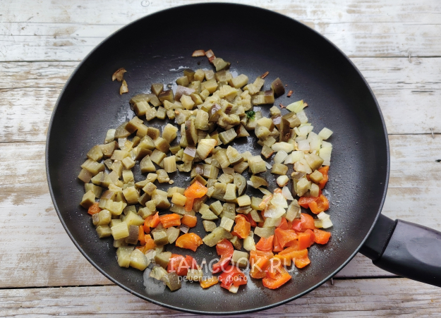 Овощи можно использовать свежие или замороженные. Овощи (баклажан, перец, лук) нарезать маленькими кубиками, томаты натереть на дольки. Выложить их на разогретое в сковороде масло.