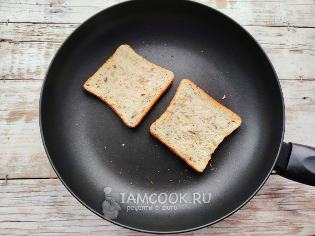 Ломтики хлеба подсушить на сухой сковороде (без добавления масла), перевернув во время жарки, чтобы они были сухими с обеих сторон.