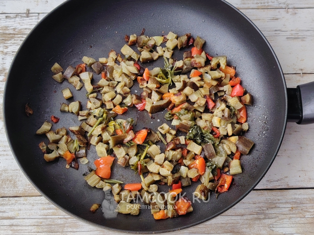 Добавить соль, рубленую зелень. Обжарить овощи до мягкости и готовности, помешивая лопаткой.