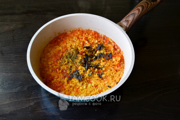 Сделайте огонь тихим и варите 20-25 минут. В конце варки добавьте прованские травы, сушеный базилик. Перемешайте. Чечевица по-итальянски готова.