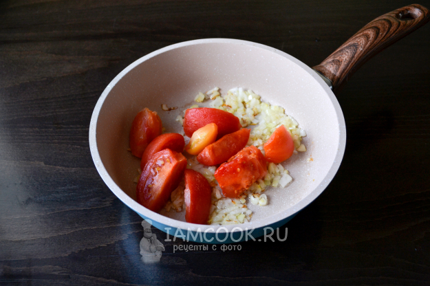 Снимите шкурку с помидоров, положите в сковороду.