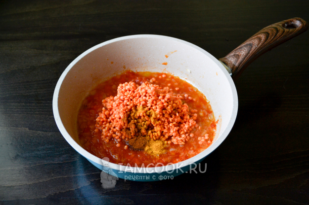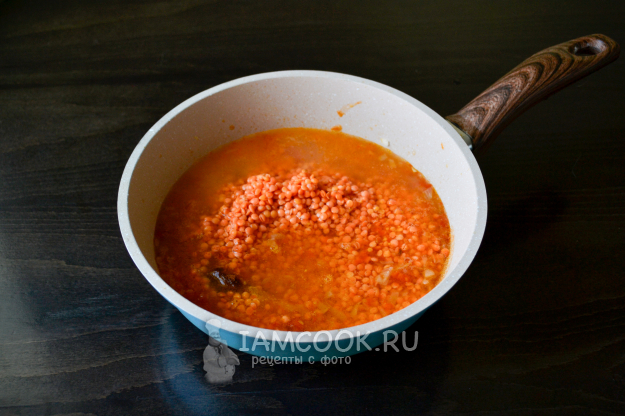 Положите в сковороду промытую красную чечевицу, всыпьте паприку, куркуму, соль.