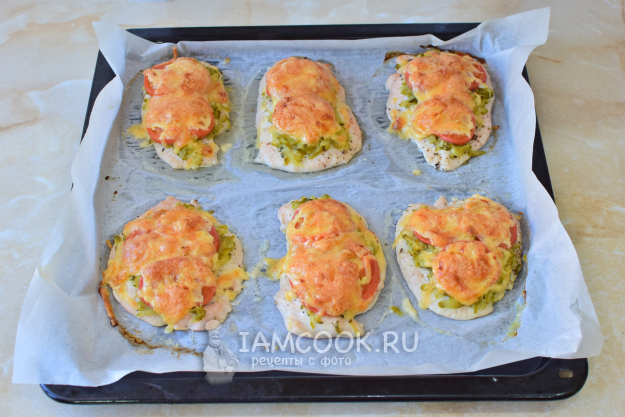 Готовую курочку извлеките из духовки. Сыр на поверхности полностью расплавился и стал немного подрумяниваться.