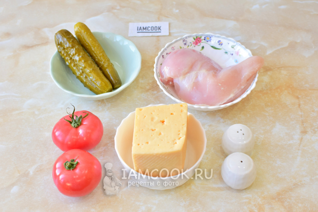 Перед началом приготовления куриной грудки с солеными огурцами в духовке соберите необходимые ингредиенты по списку. Курицу берите охлажденную. Сыр выбирайте на свой вкус, главное, чтобы он хорошо плавился.