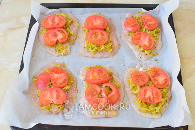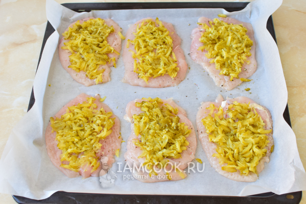 На каждый кусочек курицы разложите тертые огурцы.
