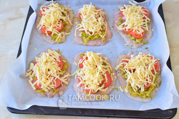 Обильно посыпьте все тертым сыром. Поставьте противень в духовку, предварительно разогретую до 180 градусов, примерно на 30 минут. Ориентируйтесь по своей духовке.