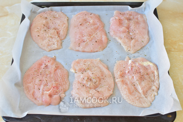 Противень для запекания застелите кулинарным пергаментом и выложите отбитое куриное филе. Посыпьте его солью и специями.