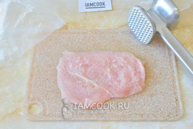 Куриное филе разрежьте вдоль на 2 части. Каждую отбейте немного с помощью кухонного молоточка. При отбивании накрывайте мясо пленкой.