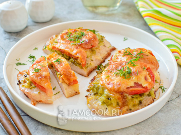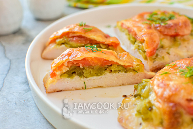 Запеченная в духовке куриная грудка с солеными огурцами готова к подаче на стол. Разложите её по тарелкам и подавайте. Приятного аппетита!
