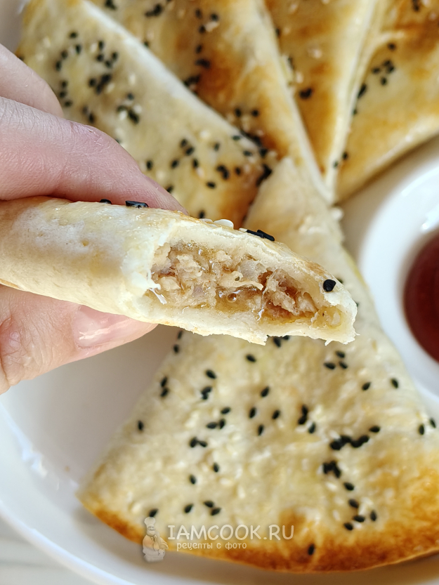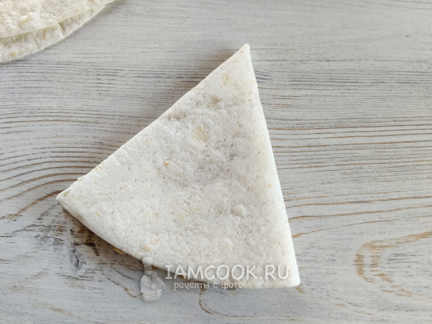 Треугольники из тортильи с начинкой запекать при 180 градусах 10 минут (у меня духовка с конвекцией).
