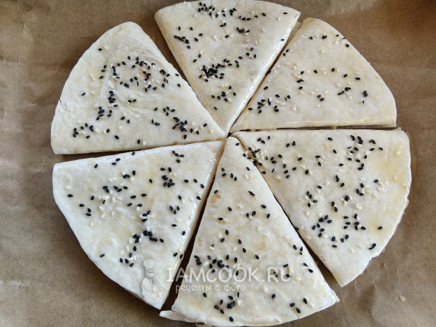 Смазать яйцом и посыпать кунжутом.