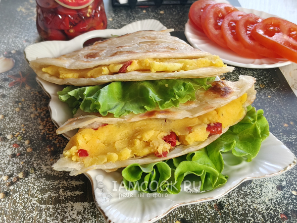 Положить на одну сторону лепешки картофель.