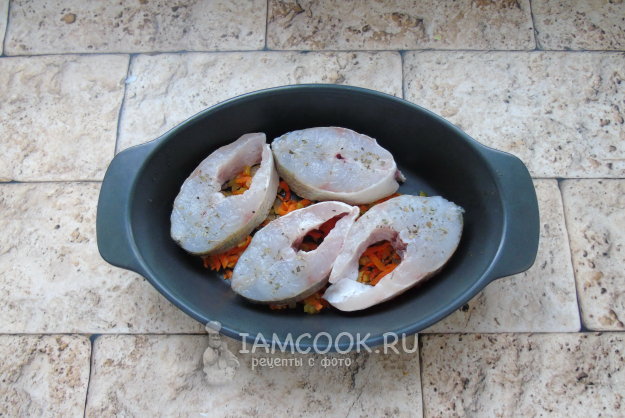 Рыбу посолите и поперчите со всех сторон. Можно взять любимые приправы. Выложите в форму для запекания на овощи.