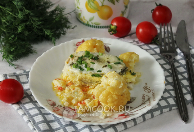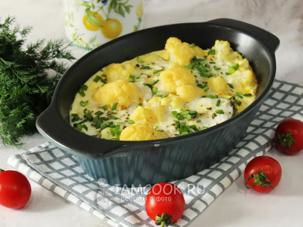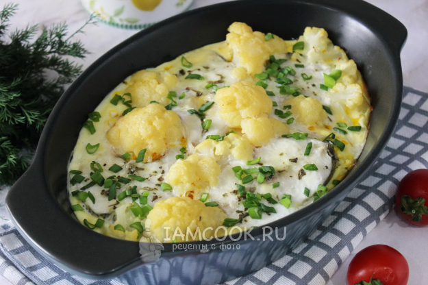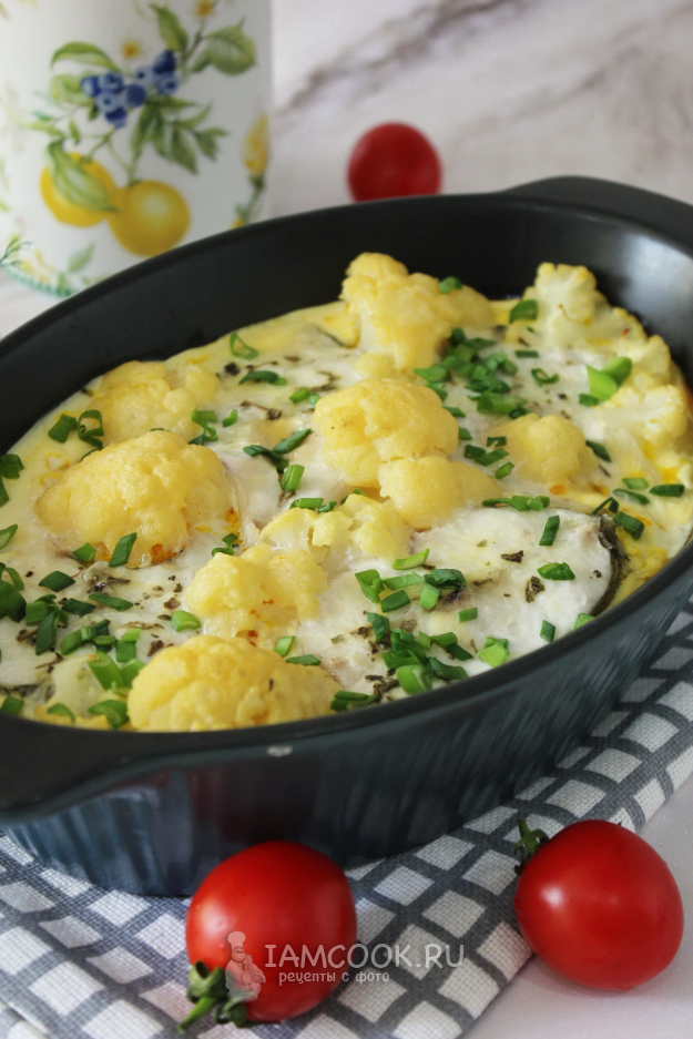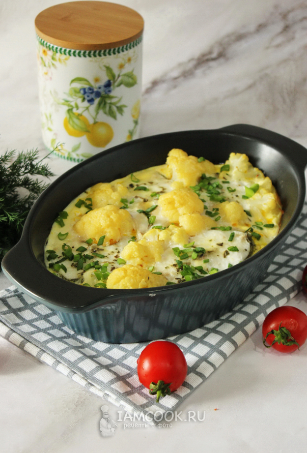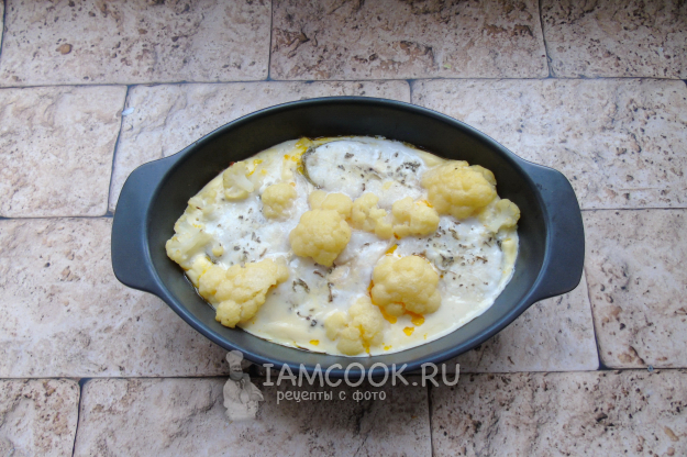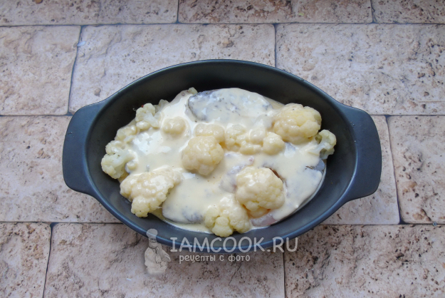 Приготовленной смесью залейте рыбу с цветной капустой в форме.