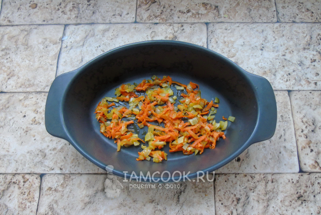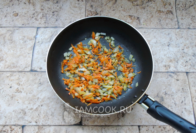 Морковь и репчатый лук очистите и помойте. Лук мелко нарежьте, а морковь натрите на терке. Выложите в сковороду с растительным маслом и пассеруйте 7-8 минут на небольшом огне.