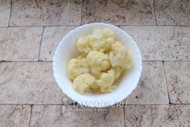 Цветную капусту разберите на соцветия и выложите в кастрюлю с водой, посолите по вкусу. Варите с момента закипания 6-7 минут. После достаньте из кастрюли.