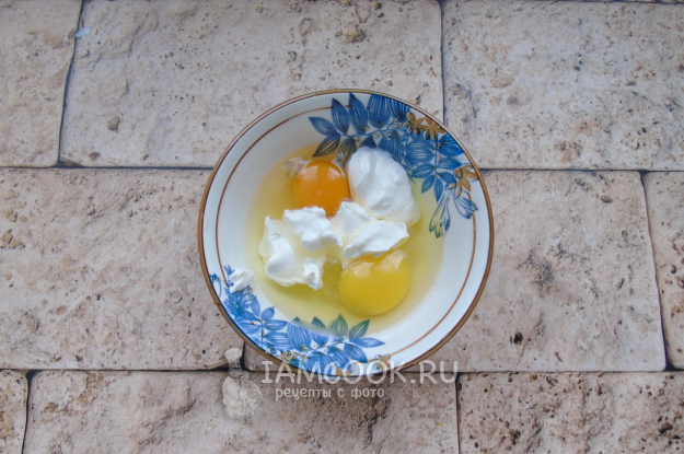 В салатник разбейте яйца, добавьте сметану. Посолите и перемешайте.