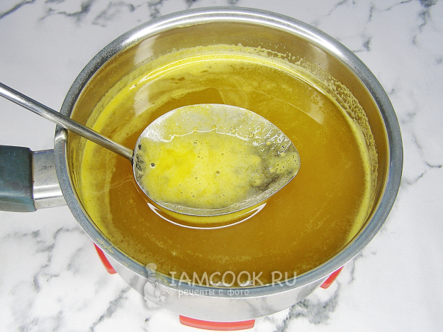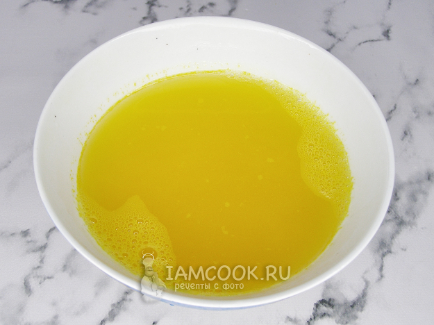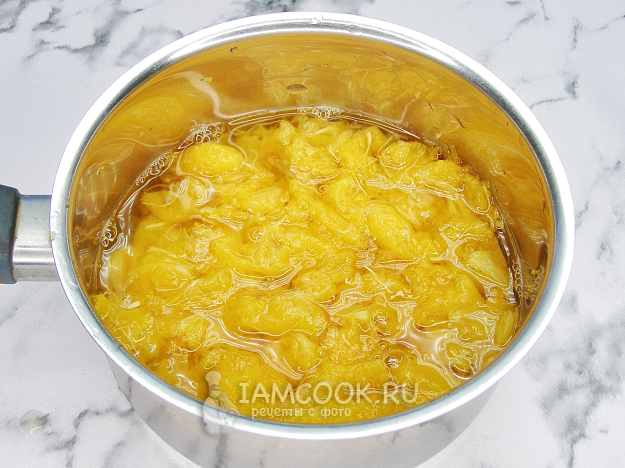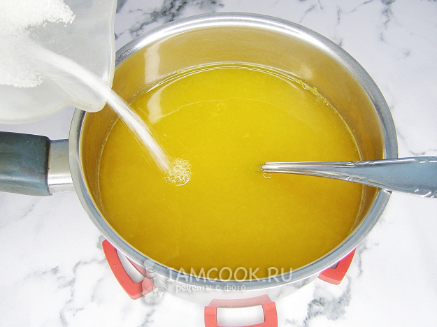 В сотейник переливаем свежий сок и отвар из мякоти мандаринов. На среднем огне нагреваем примерно до 40-45 градусов и тонкой струйкой всыпаем сахар с желатином, постоянно перемешивая ложкой или венчиком, чтобы не образовывались комочки.