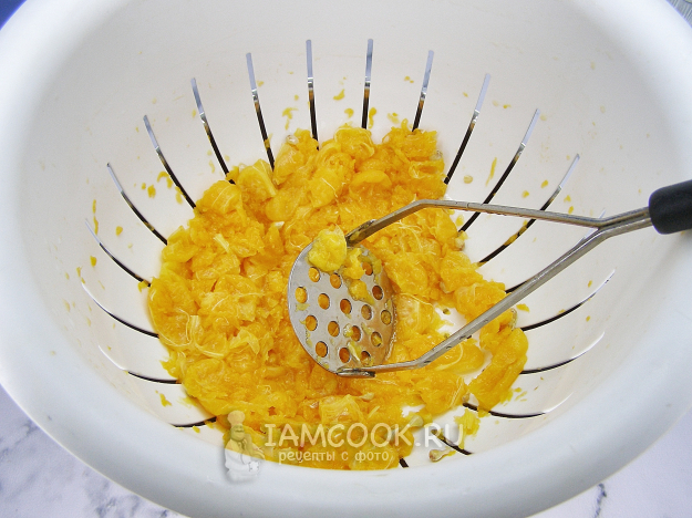 Перекладываем нарезанные мандарины в крупное сито или дуршлаг и с помощью толкушки выдавливаем сок. Можно воспользоваться соковыжималкой.