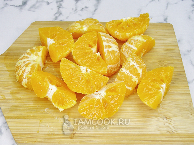 Мандарины очищаем от кожуры и нарезаем крупными кусочками, чтобы удобнее было выдавливать сок. Если будут попадаться косточки, их лучше удалить.