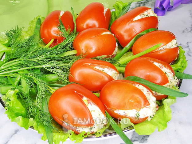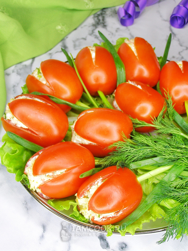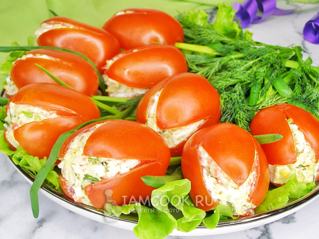 С помощью чайной ложки аккуратно наполняем помидоры приготовленным салатом. Чтобы букет выглядел свежим, фаршируйте помидоры незадолго до подачи, так как овощи могут пустить сок от соли.