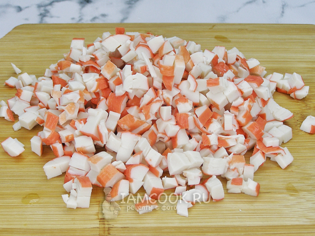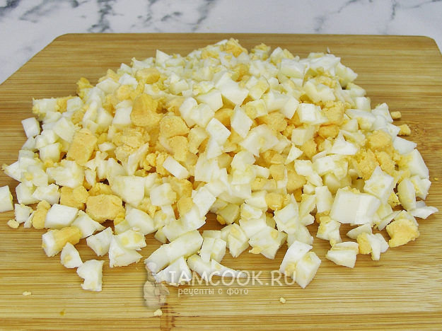Яйца отвариваем в течение 8 минут после закипания и охлаждаем в холодной воде. Очищаем от скорлупы и нарезаем маленькими кубиками.