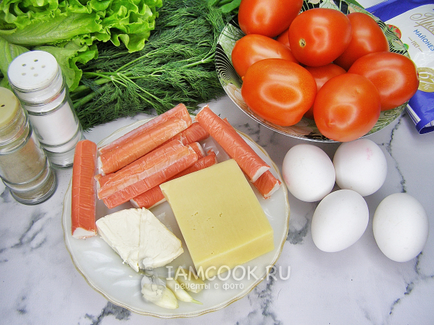 Соберём продукты для приготовления салата «Тюльпаны» с крабовыми палочками. Помидоры лучше всего выбрать сливовидной формы, плотные и без повреждений. Если крабовые палочки были замороженные, то их нужно заранее разморозить. Плавленый сыр, наоборот, желательно убрать в морозилку на полчасика, чтобы он подмёрз и его легче было натирать на тёрке.