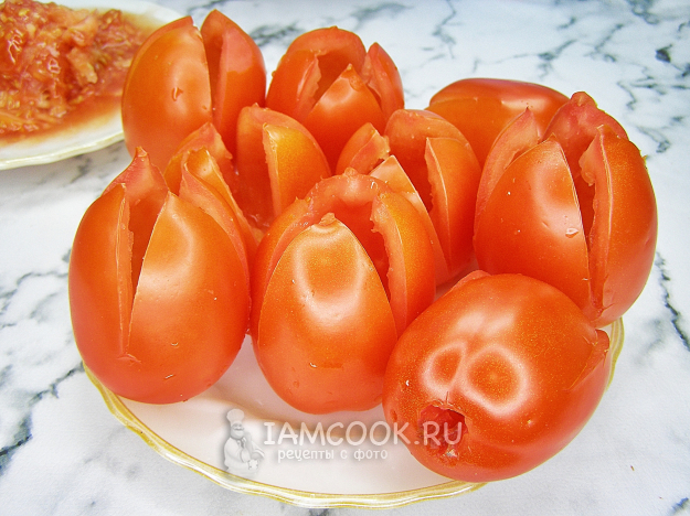 Помидоры разрезаем крест-накрест примерно наполовину или на 2/3, небольшим ножом аккуратно надрезаем перегородки и чайной ложкой вынимаем мякоть. Плодоножку тоже аккуратно вырезаем.
