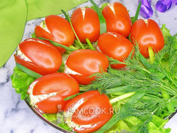 Салат «Тюльпаны» с крабовыми палочками готов. Приятного аппетита!