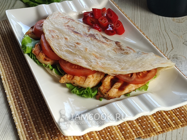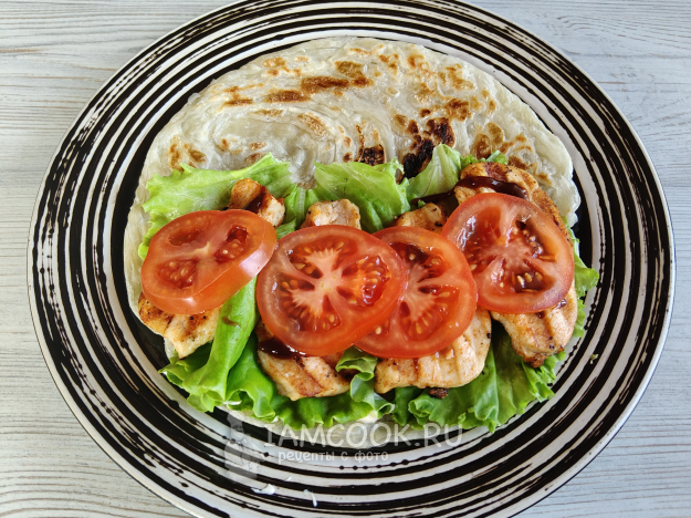 Сложить лепешку, накрыв начинку. Лепешка роти с курицей готова к подаче.