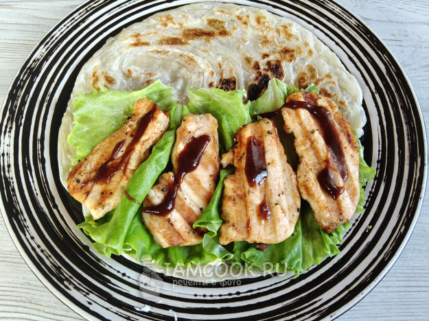Положить листья салата. Сверху - кусочки теплой курицы, ее полить соусом барбекю.