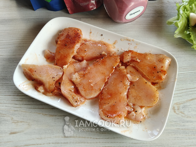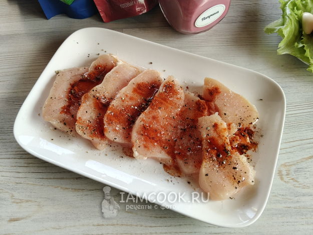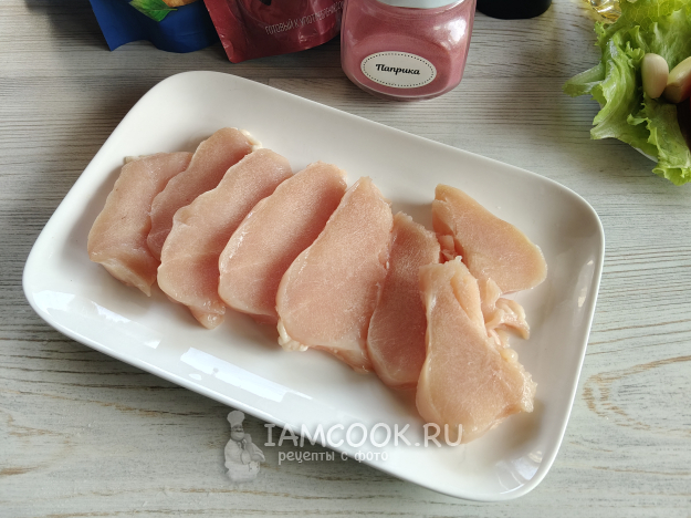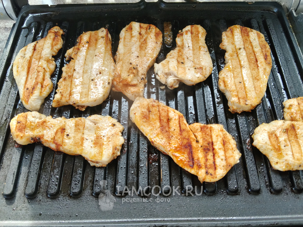 Курицу пожарить на гриле до прозрачного сока внутри, тонкие кусочки приготовятся быстро, главное - не пересушить.