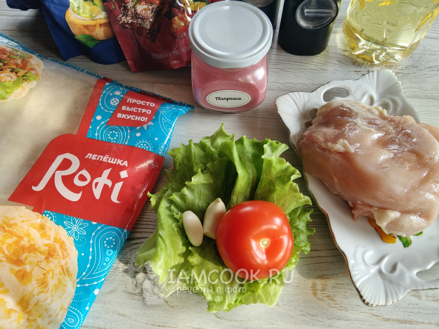 Возьмите необходимые ингредиенты для приготовления лепешки роти с курицей.